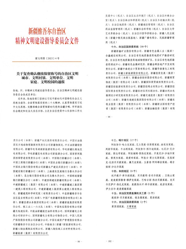 近日,自治區(qū)精神文明建設指導委員會《關于復查確認繼續(xù)保留稱號的自治區(qū)文明城市、文明村鎮(zhèn)、文明單位、文明家庭、文明校園的通報》(新文明委〔2023〕4號)正式發(fā)布,集團公司本部、立新能源公司順利通過“自治區(qū)文明單位”復查驗收,王博同志家庭繼續(xù)保留文明家庭稱號。