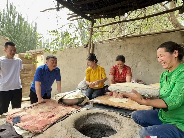 民族團(tuán)結(jié)一家親活動中,吳華與結(jié)親戶買提卡斯木·阿布都外力及其妻女、母親、兄弟等親切交流,了解家人的身體健康狀況、家庭收入、工作生活等情況,并與買提卡斯木·阿布都外力家人共同打馕。