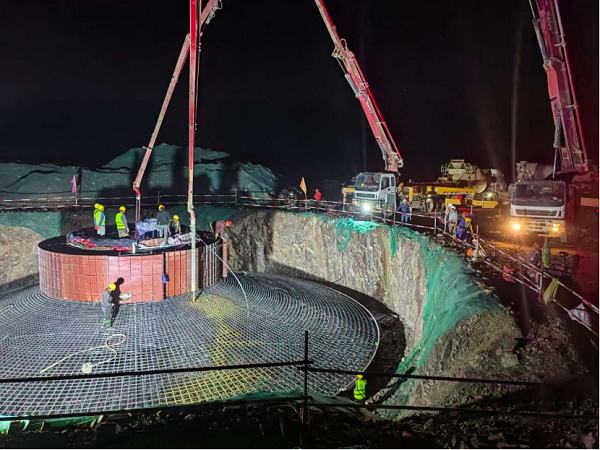 該工程位于昌吉州奇臺縣境內(nèi),風(fēng)電場場地地貌特征為剝蝕殘丘,地形地貌較為復(fù)雜,本次澆筑的風(fēng)機基礎(chǔ)為金風(fēng)6.7MW機型,風(fēng)機基礎(chǔ)直徑為22米,基坑深度為4.2米。為確保首臺風(fēng)機基礎(chǔ)澆筑順利完成,立新能源公司多次組織設(shè)計單位、監(jiān)理單位、施工單位和設(shè)備廠家召開工程例會及專題協(xié)調(diào)會議,審核編制大體積混凝土施工專項方案,提前對參建人員進(jìn)行安全技術(shù)交底,對混凝土澆筑、養(yǎng)護(hù)等細(xì)節(jié)進(jìn)行周密安排,并多次考察商砼站,確保混凝土供應(yīng)及時可靠,安排專人專責(zé)進(jìn)行逐一核查,嚴(yán)格執(zhí)行相關(guān)技術(shù)方案與施工標(biāo)準(zhǔn),嚴(yán)把施工質(zhì)量,梳理安全隱患,避免了施工過程中可能出現(xiàn)的隱患或不利影響。在經(jīng)過12個小時的連續(xù)作業(yè)后,814方混凝土成功入模,進(jìn)而轉(zhuǎn)入首臺風(fēng)機基礎(chǔ)大體積混凝土澆筑收光作業(yè)。